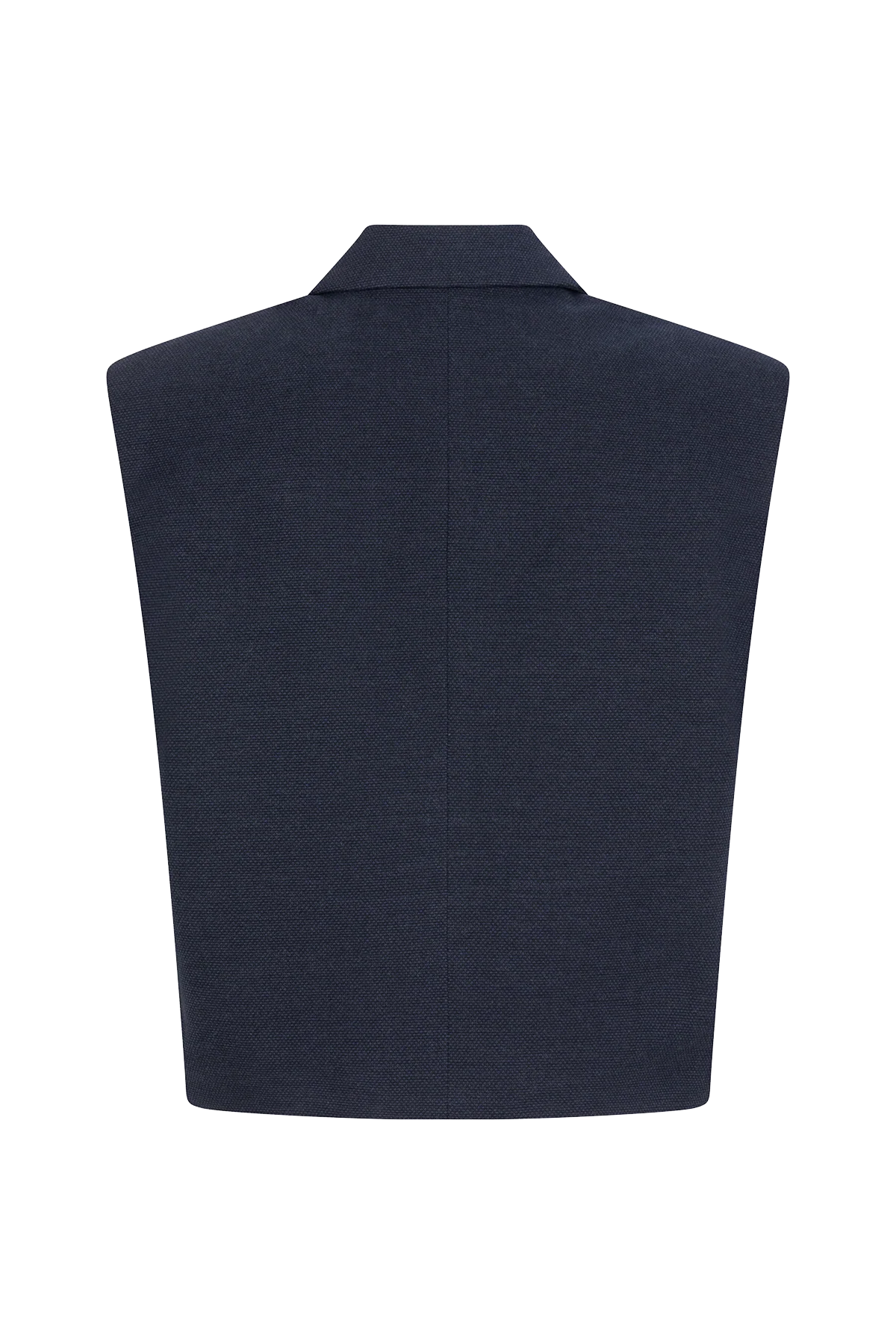 Kort gilet met kraag en dubbele paspelzakken. Gemaakt in een prachtige structuurkatoen. Creëer een vrouwelijk silhouet met de schoudervulling en de cropped pasvorm. Het sluit met één onzichtbare knoop.